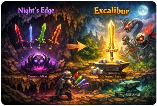 エクスカリバーを手に入れた後も、さらなる「強化」が待っています。テラリアの醍醐味は、苦労して作った武器を素材にして、さらに強力な武器へと進化させることです。
