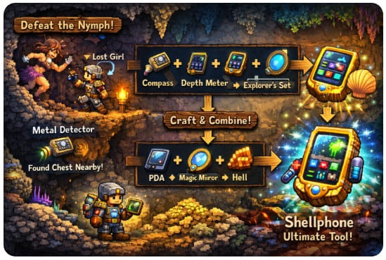 合成を進めるには「よろずや(Goblin Tinkerer)」から購入できる「よろずやの作業台」が必須となります。金属探知機を入手したら、まずは地下探索で手に入る「羅針盤」や「水深計」と組み合わせて、情報系アクセサリーを集約することを目指しましょう。最終的なシェルフォンまで辿り着けば、情報の確認だけでなく、リスポーン地点や海、地獄などへのワープ機能まで備わった、まさに究極の探索ツールとなります。素材集めは大変ですが、金属探知機はその中核を担う重要なパーツなのです。