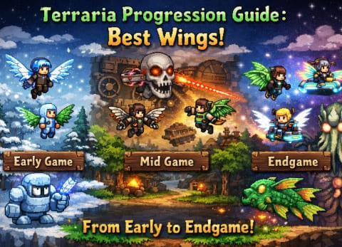 テラリアの攻略は段階的に進むため、翼もその時点で購入またはクラフト可能なものから選ぶ必要があります。まずは、各攻略フェーズにおいて「これさえ持っていれば間違いない」という翼を厳選して比較しました。翼の性能は主に「飛行時間」と「最高速度」で決まりますが、入手しやすさも重要な選定基準となります。